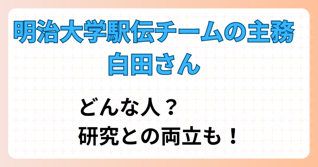 明治大学駅伝チームを支える「主務」白田さんが話題です。 テレビで明治大学駅伝チームを見て、「この女性、誰?」と気になった人も多いのではないでしょうか。 白田さんは、チームの運営やサポートを担いながら、学業も両立させる「スーパー女子大生」な... -